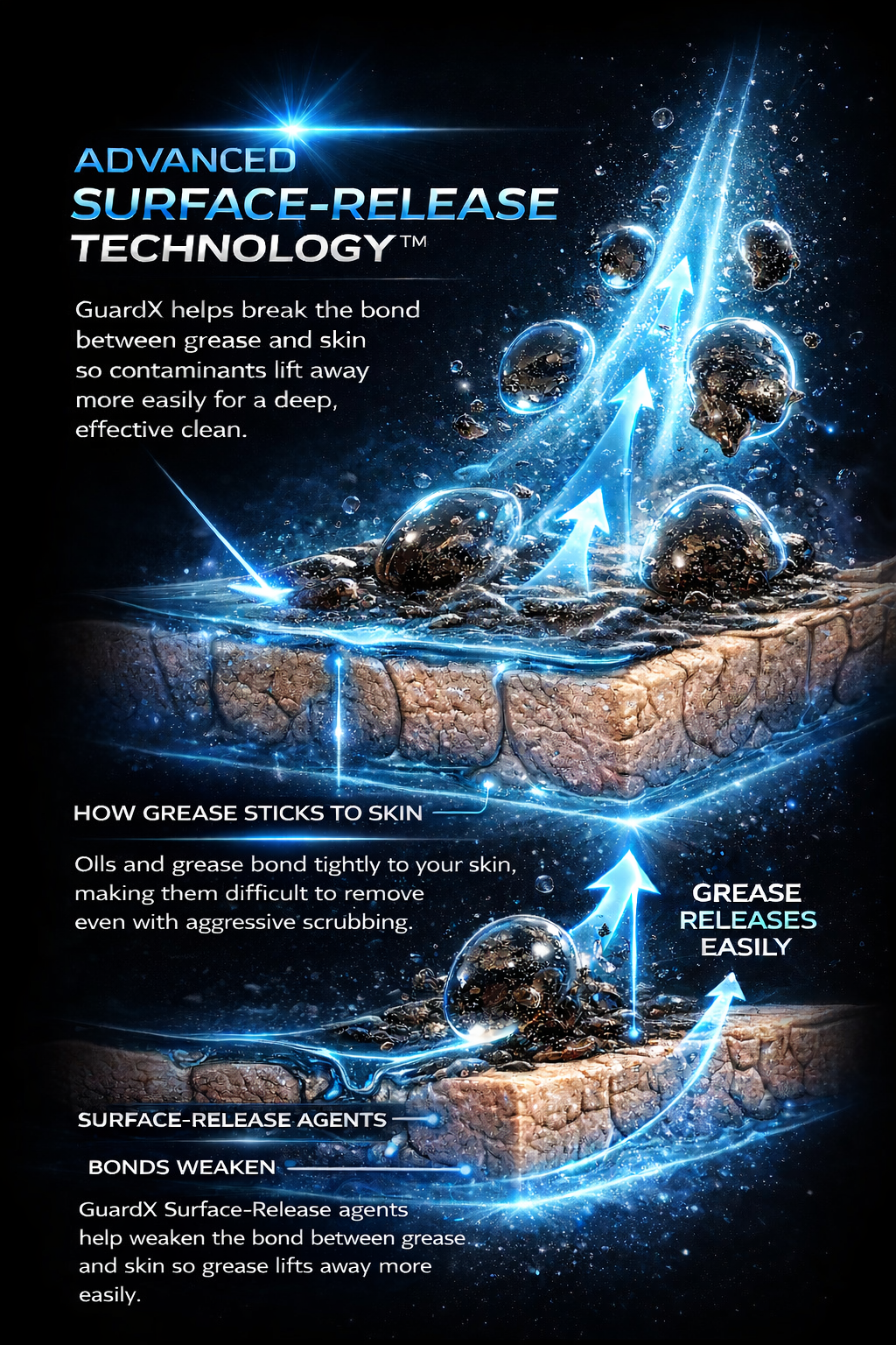 Instead of relying solely on harsh solvents or excessive abrasives, GuardX helps weaken the bond between grease and the surface of the skin.